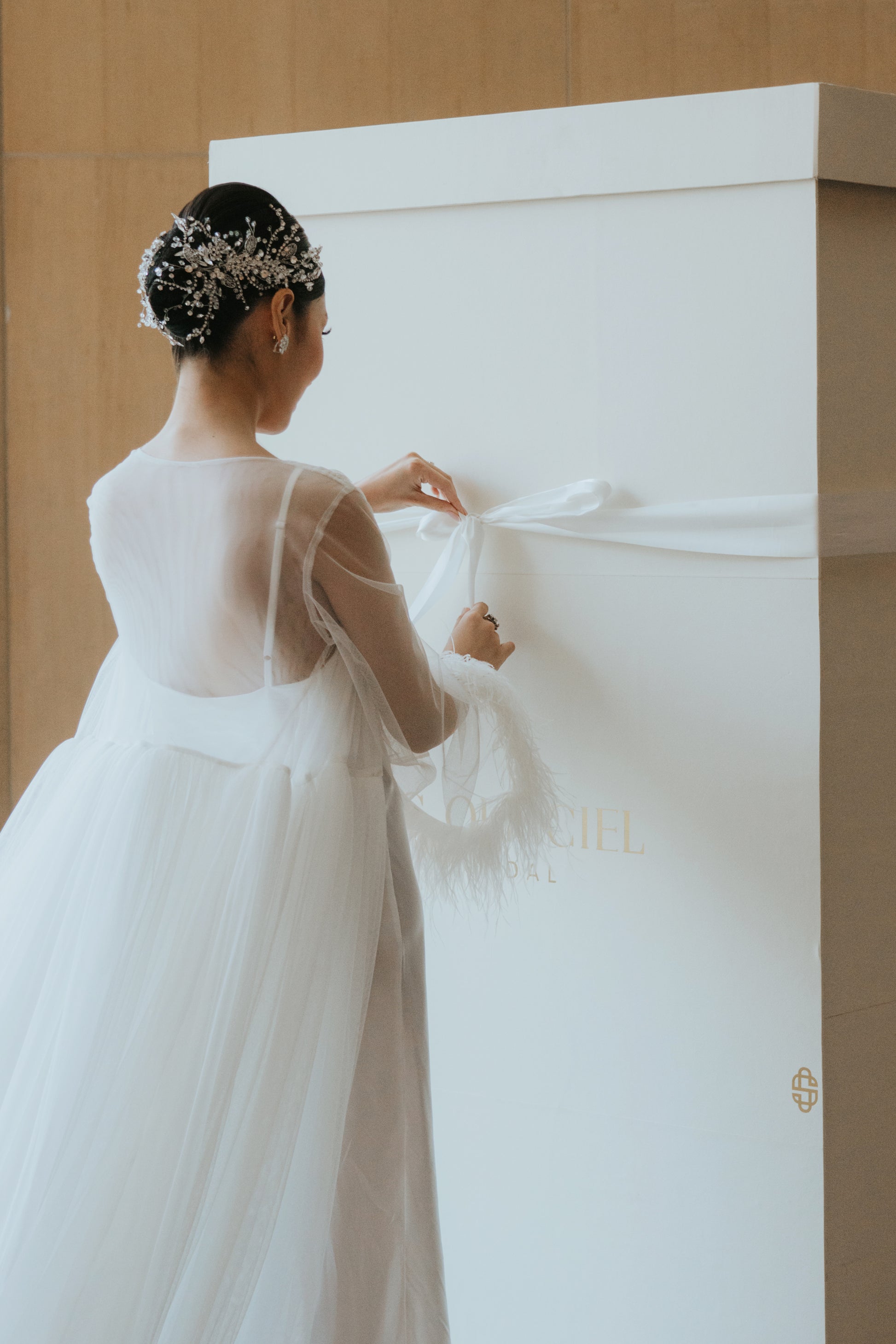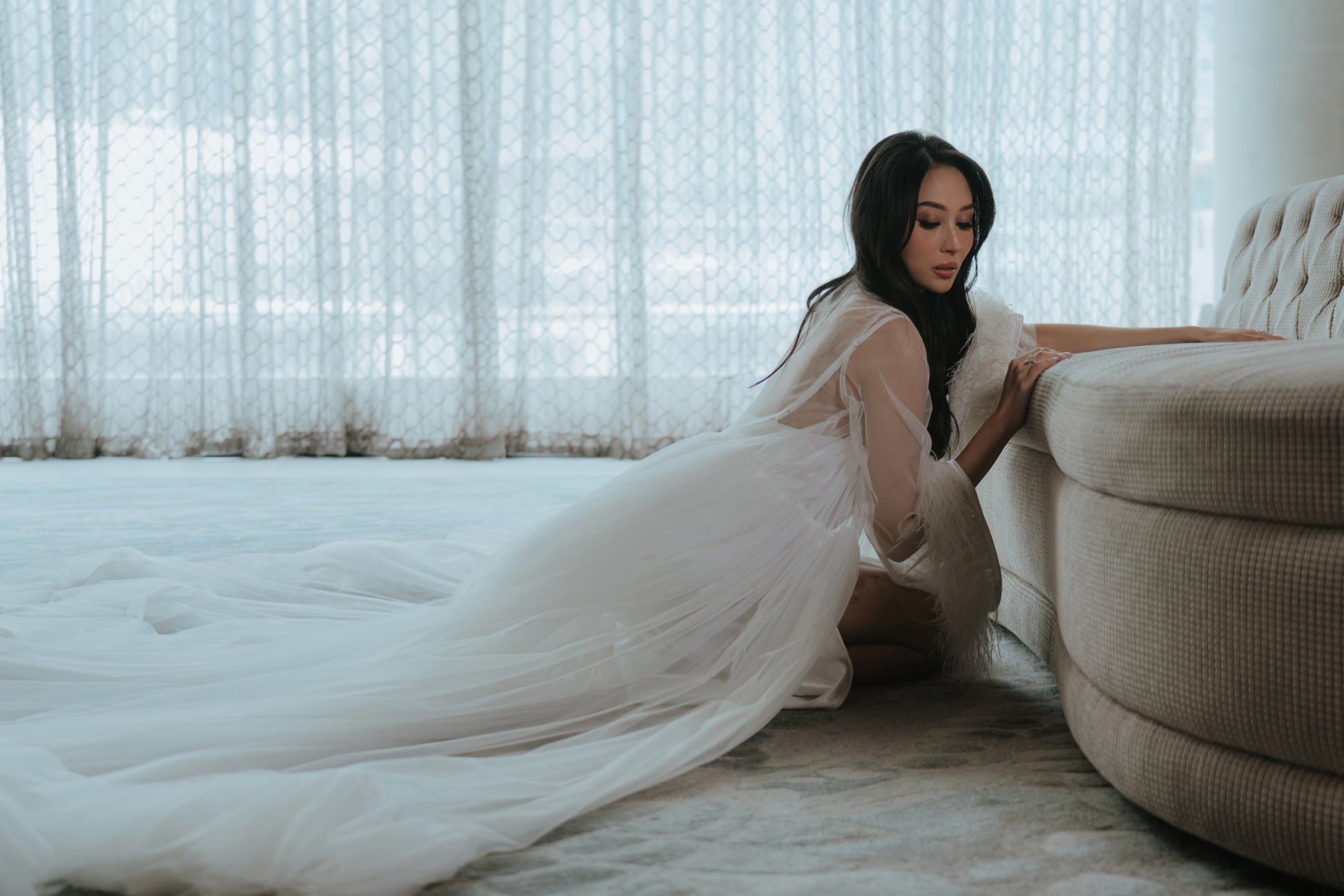 Crafted from delicate tulle fabric, feather trimmed sleeves, with shirring on the bottom of the train.